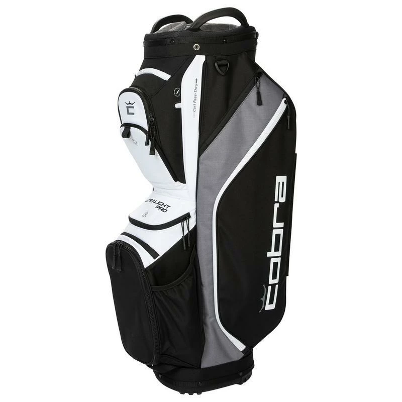 Cobra Ultralight Pro Cart Bag The Cobra Ultralight Pro Cart Bag has been released as a perfect transport for the new LTDx range of long distance golf clubs.& Designed to fit perfectly on a push trolley or electric trolley, this cart bag features a 14-way-top that uses three full-length dividers. This means that you keep your clubs nicely separated and allows for easier access too.& Storage is a big component of this bag with eleven separate pockets for all your personal belongings and anything else you could possibly need on the golf course, including two giant outerwear pockets for maximum storage.& This storage also includes an insulated pocket that allows for upto nine cans of your favourite drink to be kept cold while you play your way round the course. Also included is a magnetic range finder pocket that allows you to easily access your rangefinder whenever you need it.& At only 5lbs this is an incredibly light cart bag that comes in a very stylish Cobra design.& Features Eleven separate pockets, including two giant outerwear pockets for maximum storage. Magnetic Range Finder Pocket The magnetic pocket allows easy access to your rangefinder. 14-Way Top has three full-length dividers for simple club access. Up to nine cans of your favourite beverage can be kept cold in the insulated pocket. Built-in pass-thru allows you to attach to a trolley without limiting pocket access. Weight – 5lbs &