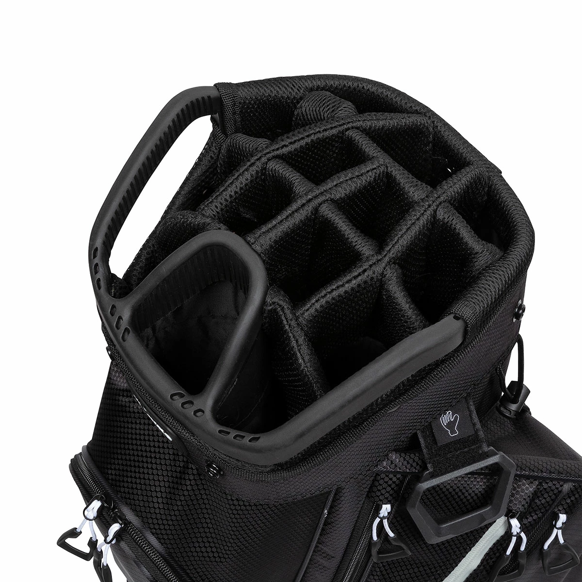 It helps keep your clubs organized with an oversize 9″ top cuff, with 14-way graphite friendly separators and 3 full-length club dividers to make selecting a breeze. The divider top features a front positioned putter well to accommodate modern oversize putter grips, and even has 4 lift points including side handles built-in to the top cuff.