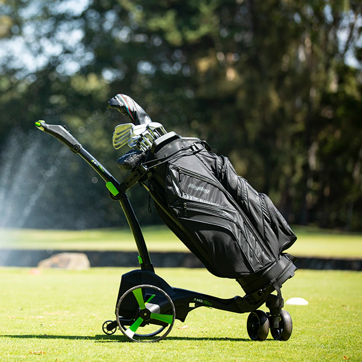 MGI has engineered this trolley to be 12% lighter and 25% smaller for greater space-saving. It has a 4-wheel design with a swiveling front wheel which is lockable, with a foldable rear 4th wheel for added stability. The trolley also features quick-release rear wheels and are all fitted with all-terrain treads to provide more performance on the turf. Plus has independent top bag supports and a lower bag strap to secure your bag to the trolley with ease.