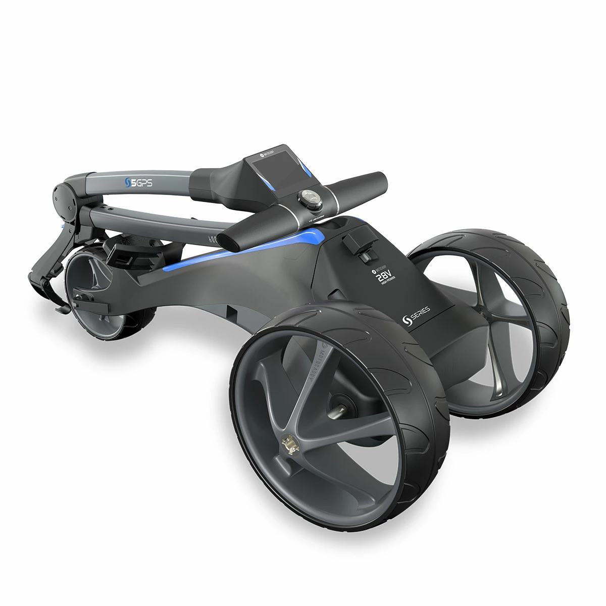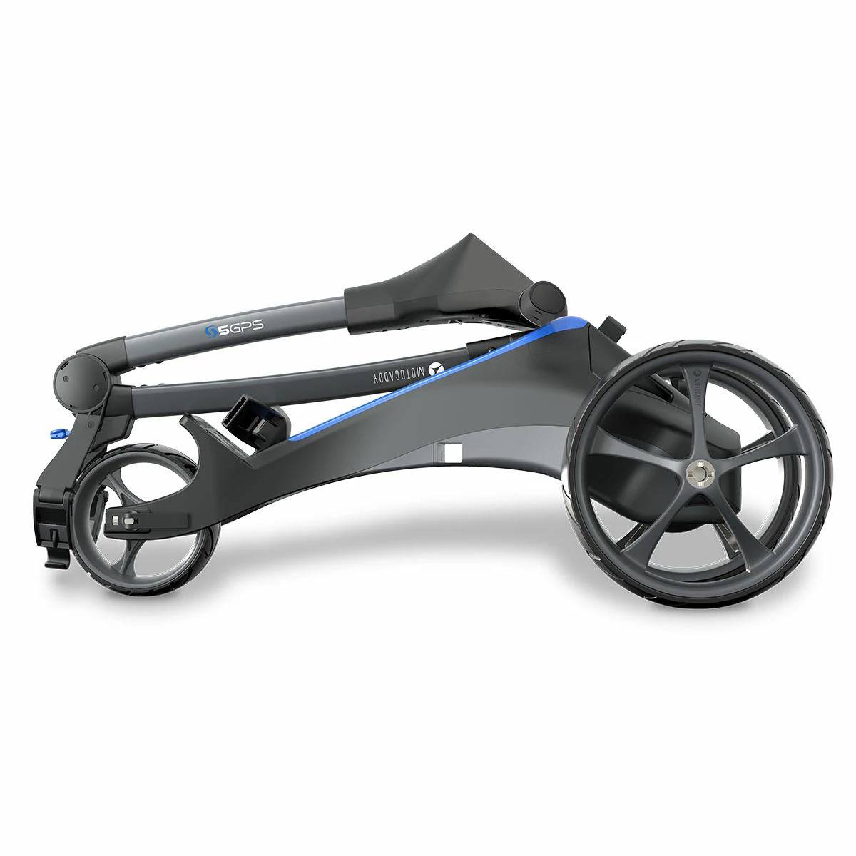 The Motocaddy S5 GPS electric golf trolley is compact and easy to fold, offering fully‑integrated GPS for over 40,000 pre-loaded courses through its super-responsive 3.5” touchscreen display.
