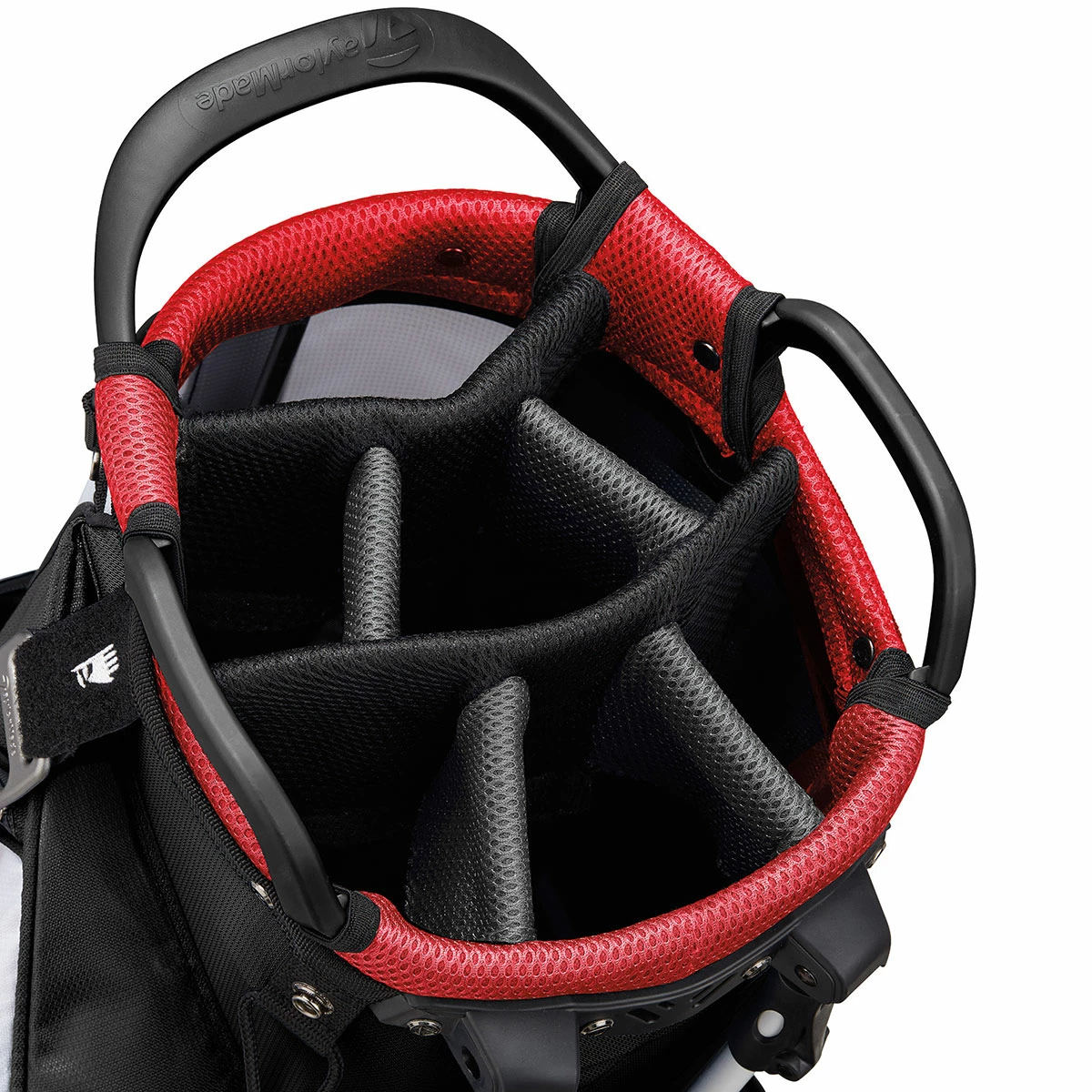 This superbly designed TaylorMade Select Plus Stand Bag features a 7-way top (9″) with a front integrated grab handle and 2 grab handles on the side covered with colour-coordinated air mesh cushioned fabric, with full length dividers.