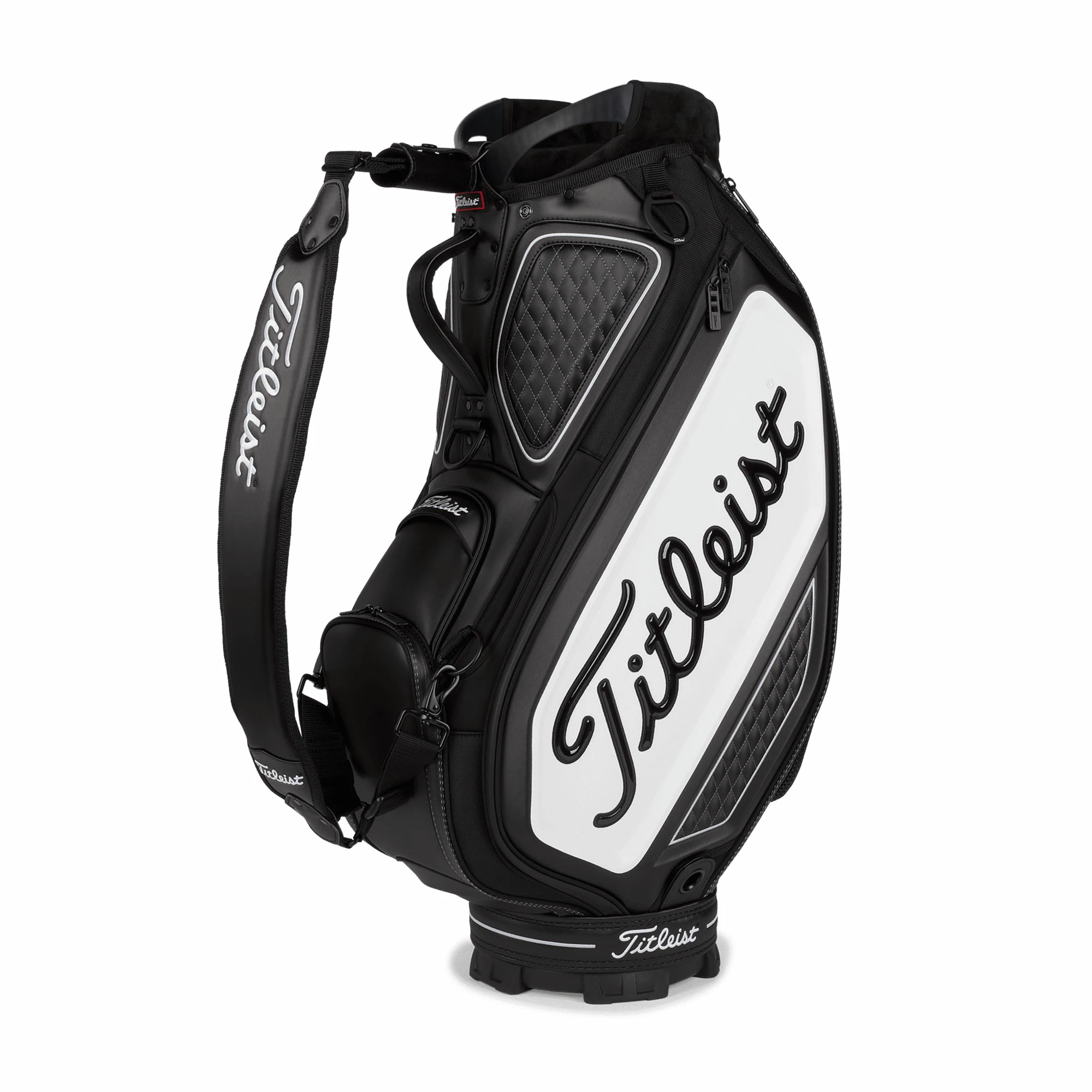 Titleist Tour Series 9.5" Golf Tour Bag Titleist has created the Tour Series Golf Tour Bag so that golfers are able to use a golf bag that has been tried and tested by professional golfers on the Tour and from the PGA. This golf bag offers players incredible styling, premium construction and lightweight design that is perfect for every golfer out on the course.& This Titleist golf bag has been constructed to be incredibly lightweight when compared to other golf tour bags, at only 4.8 kg. The lightweight design means that it is much easier for golfers to carry the bag around a golf course all day without feeling sore afterwards. To make it even easier to carry this golf bag Titleist has included a 3-point single shoulder strap which provides players with much more comfortable support while carrying the bag and has been tested by several professionals who approve of this strap.& Titleist has designed this golf bag to make it much easier for players to store their golf clubs in a much more organised way by including a 5-way top. This design allows golfers to spit their set of clubs into 5 separate groups so that it is much easier to get to the right golf club even in high-pressure situations.& To ensure that you have everything you need with you out on the golf course to have a great round this Titleist golf bag has been designed to include 10 pockets. This large number of pockets makes it so much easier to bring all the accessories and equipment you need, such as golf clothing, golf balls, waterproofs and rangefinders. One of the pockets that have been included is a velour-lined valuables pocket which features a magnetic closing for easier access. Features Tour-proven 3-point single shoulder strap Durable materials and quilted highlights Premium metal hardware 5 Way top cuff with integrated handles Magnetic, velour-lined valuables pocket New interior organisation in apparel pockets Pockets – 10 Weight – 4.8kg &