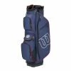 Wilson Prostaff Cart Bag – Black/White The Wilson Prostaff Cart bag range has been designed for golfers who are looking for a golf cart bag that can easily store 14 golf clubs while also having plenty of pocket space for their golf equipment. This golf trolley bag features a 14-way top, which includes a golf putter sleeve, which provides excellent golf club storage with each club having its own storage compartment which provides great organisation while also offering protection too. This protection has been increased with the use of 5 dividers which help to stop the shafts of each golf club from knocking into each other while being transported around the golf course on a golf trolley.& Wilson Golf has designed this golf cart bag to include plenty of storage space with 9 pockets that allow for easy storage of equipment such as golf balls, golf tees, GPS rangefinders, golf clothing and everything else that is needed to have a great round of golf.& This golf bag has been designed to be incredibly lightweight, weighing only 1.5kg which makes it very easy to load on and off of a golf trolley without any issues. However, if a golfer doesn’t have access to a golf trolley or the golf course they are playing on doesn’t allow them, the lightweight design makes it very easy to carry while the padded shoulder strap makes it very comfortable to. With added features such as a golf umbrella holder, towel ring, golf glove holder and rain hood this Wilson golf bag is a brilliant option for any golfer. Browse the brilliant range of Wilson golf products here . Features: New Handle Top 10” x 7.5” 5 dividers Soft mesh shaft protection Extra Storage 3 stays light construction Diamond polyester fabric 5 Closed pockets 2 Large side pockets Valuable velour pocket 1 Accessory pocket 1 Large bottom front pocket Extra Features Padded strap Umbrella holder Boot handle Towel ring / glove holder Rain hood Lightweight 3.2 lbs / 1.5 kg