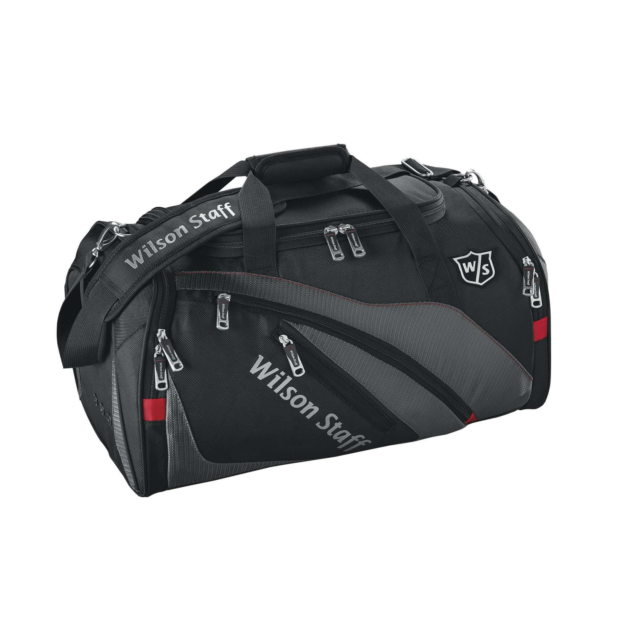 Wilson Staff Duffle Bag Wilson has created the Staff Duffle Bag so that you have the perfect carry bag to bring your golf clothing for a weekend of golf while also having enough room for plenty of accessories.& This travel bag has been created to offer golfers the perfect solution for carrying your personal belongings either by hand, with the top handles that can be secured together for maximum stability, or by the strap that features a padded cushion for extra comfort while on the move.& The duffle bag has had four zipped pockets added to the design to allow for increased storage for valuables and accessories too, with the main storage compartment, a medium-sized pocket at the end of the bag, and two small accessories pockets.& Features Material : 100% Polyester Number of closed pockets : 4 Top dimensions : L21" x W10.5" x H10.5"
